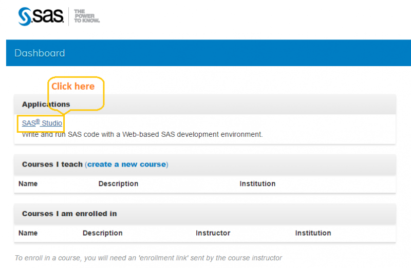 - Click on SAS Studio link on the dashboard page. See the screenshot below –